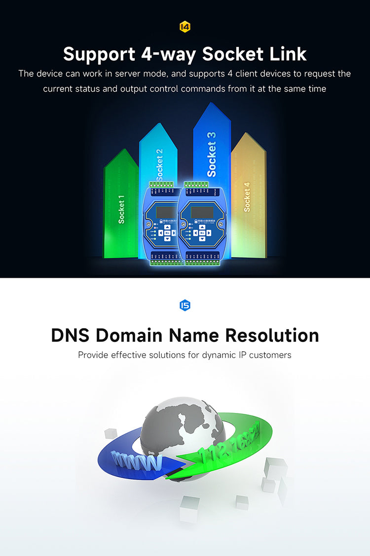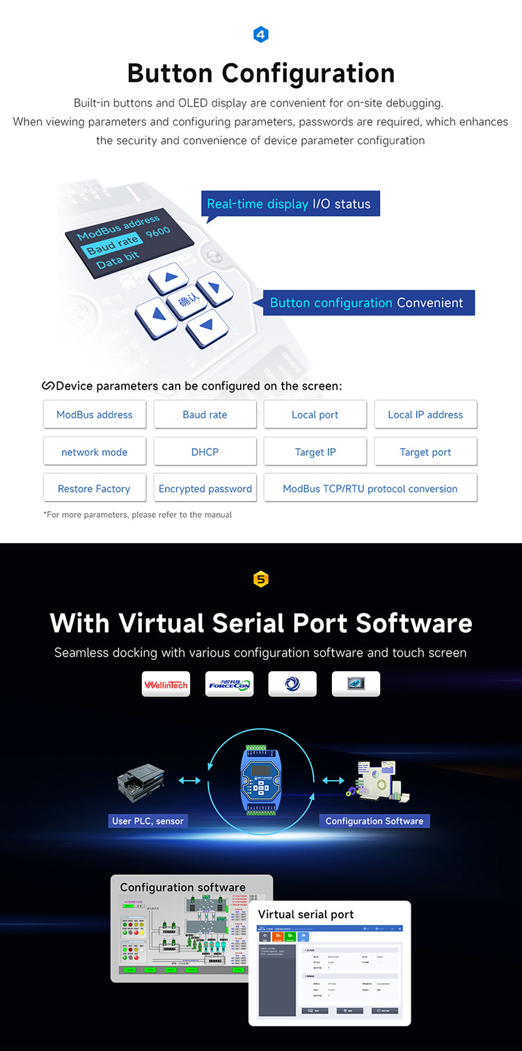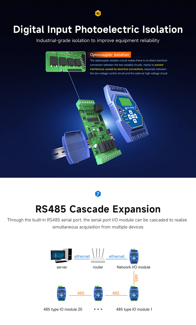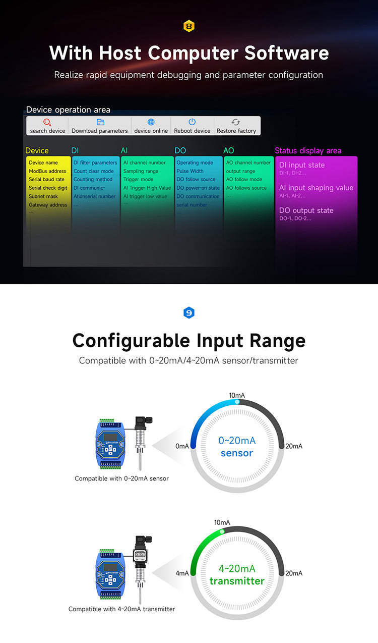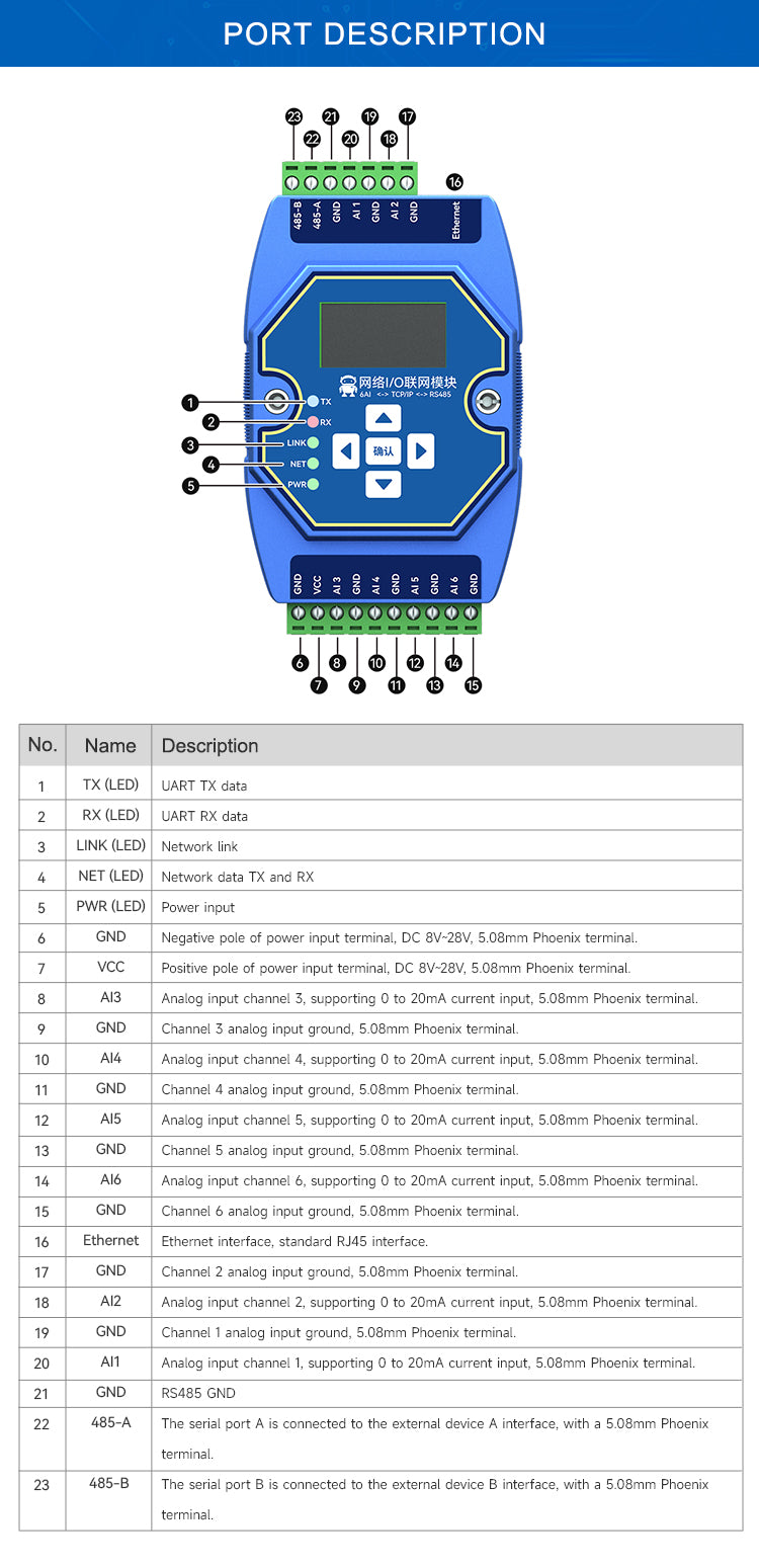 ME31-XAXX0600 is a network I/O  networking module with 6 analog (0-20mA/4-20mA) inputs, supports Modbus TCP protocol or Modbus RTU protocol for acquisition and control, and the device can also be used as a simple Modbus gateway (automatically send commands with non-local Modbus addresses through the serial port/network port).