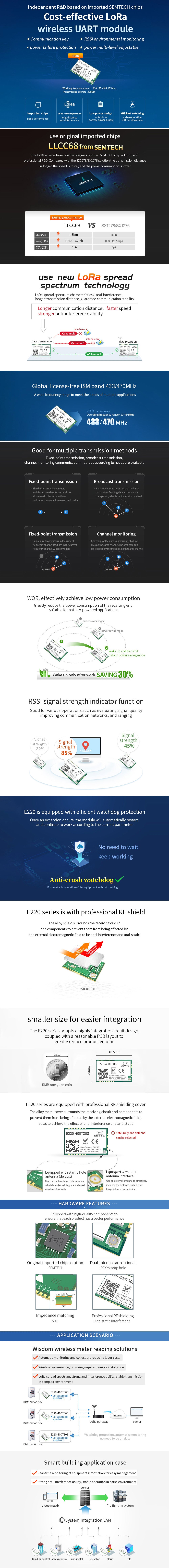 E220-400T30S is a wireless serial port module (UART) based on SEMTECH's LLCC68, with an operating frequency of 410.125~493.125MHz (default 433.125MHz), TTL level output, and is compatible with 3.3V and 5V IO port voltages.