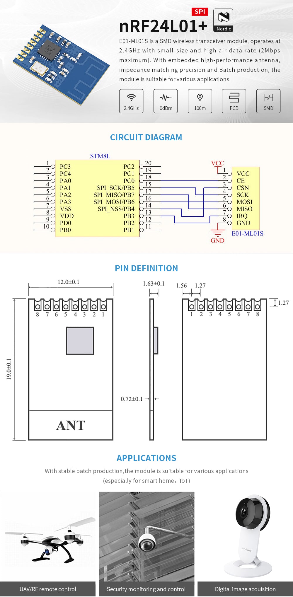 [Introduction]:E01-ML01S is a SMD wireless transceiver module, operates at 2.4GHz with small-size and high air data rate (2Mbps maximum). With embedded high-performance antenna, impedance matching precision and Batch production, the module is suitable for various applications.