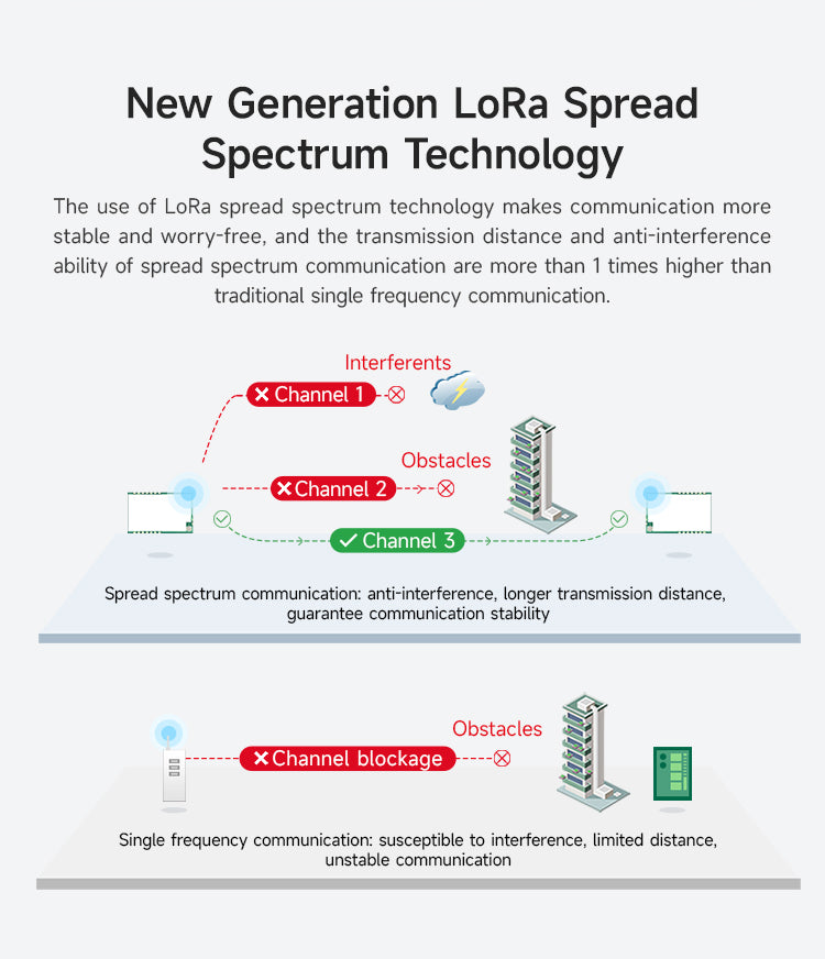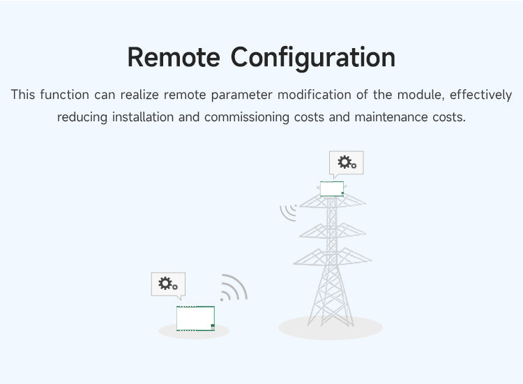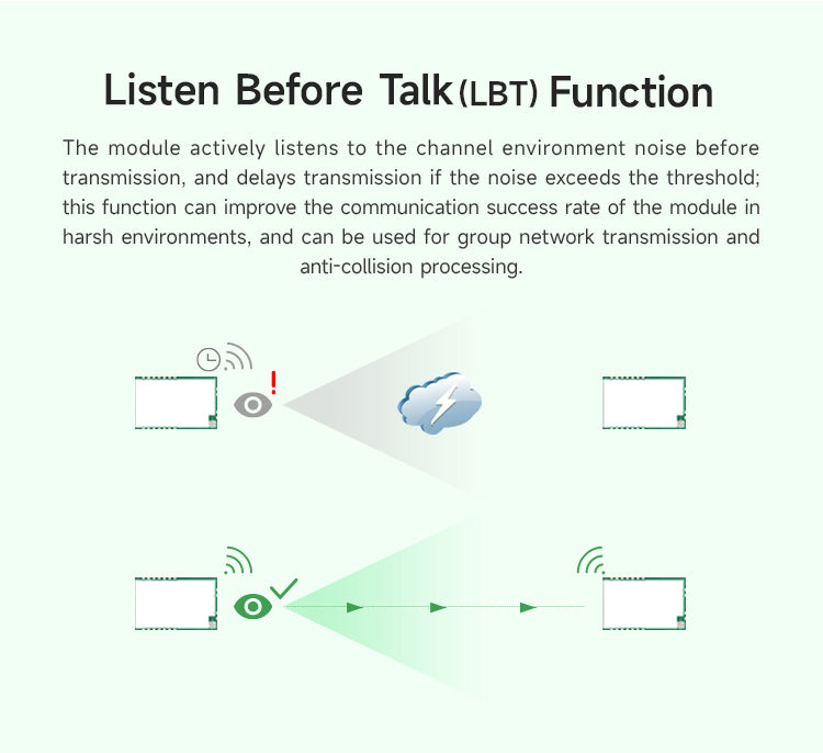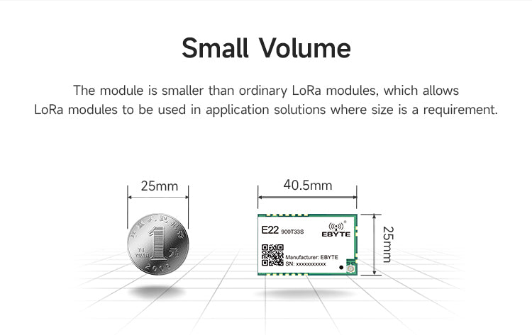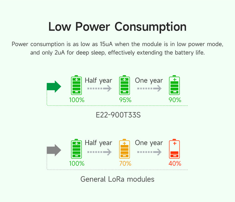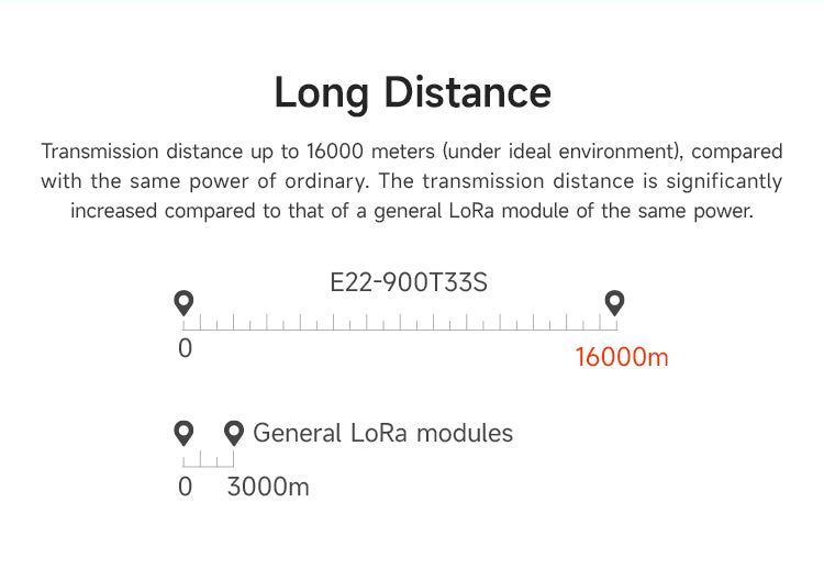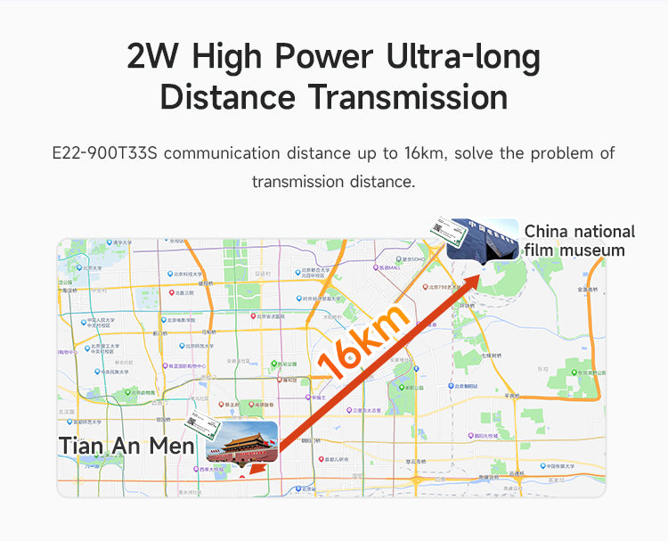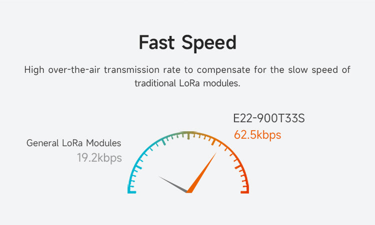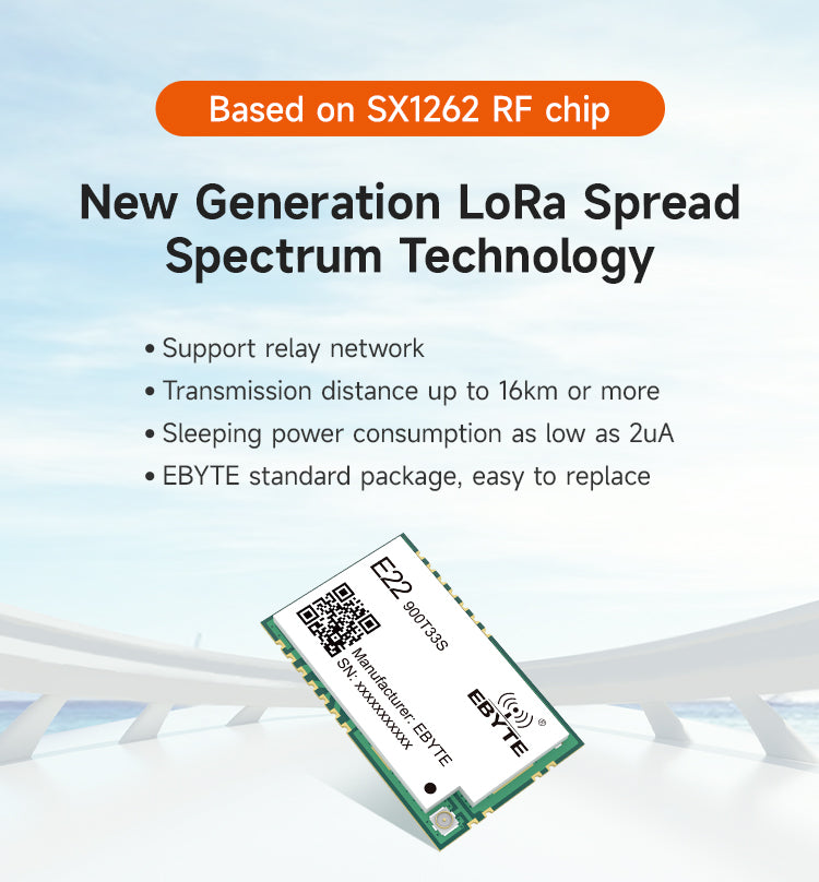 E22-900T33S is a new generation of LoRa wireless module, based on SX1262 radio frequency chip wireless serial port module (UART), with multiple transmission methods, working in the 850.125~930.125MHz frequency band, LoRa spread spectrum technology, TTL level output, compatible with 3.3V and 5V IO port voltage. Compared with the traditional SX1276 solution, the transmission distance is longer, the speed is faster, the power consumption is lower, and the size is smaller. It supports over-the-air wake-up, wireless configuration, carrier monitoring, automatic relay, communication key and other functions, supports sub-packet length setting, and can provide customized development services.