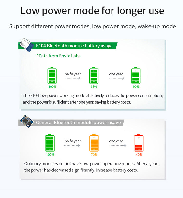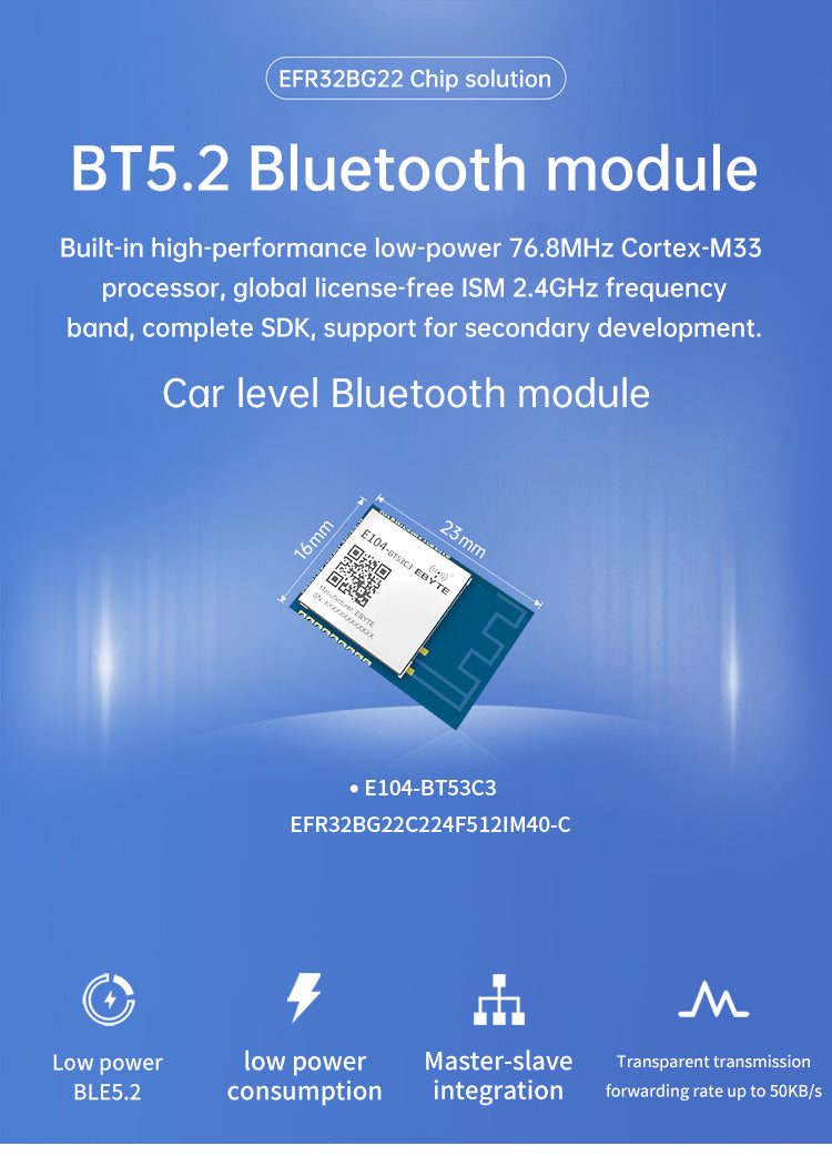 Product introduction: E104-BT53C3 is a serial port to BLE Bluetooth module based on Bluetooth protocol version 5.2, which has the characteristics of high temperature resistance, small size, low power consumption, long transmission distance, strong anti-interference ability, etc., working in the 2.4GHz band.