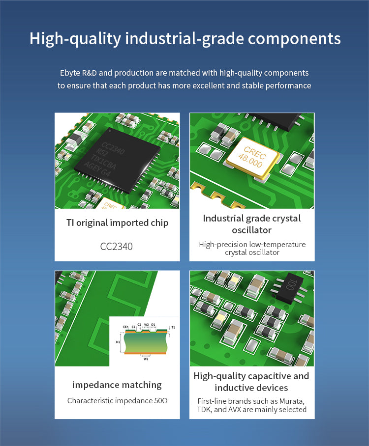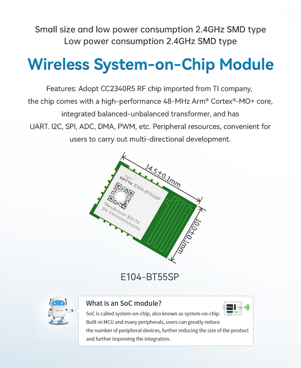 [Introduction]:E104-BT55SP is a small-sized, low-power ble module based on ble protocol version 5.3, working in the 2.4GHz frequency band. The E104-BT55SP module is developed by Ebyte based on the CC2340R5 chip of Texas Instruments (TI). The ble module has a 48-MHz Arm® Cortex®-M0+ processor, an integrated balanced-unbalanced transformer,and UART, I2C, SPI, ADC , DMA, PWM and other rich peripheral resources, and at the same time lead out all IO ports, which is convenient for users to carry out multi-directional development. The maximum supported baud rate is 3Mbps.